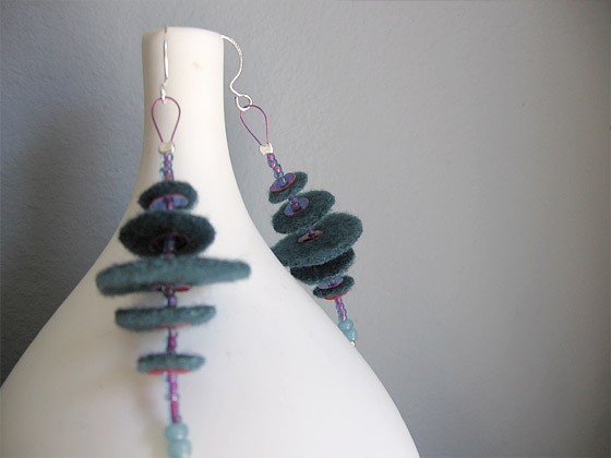 These earrings were made using dark blue felt disks, light blue and clear blue+purple round beads and purple iridescent disk beads.Their total length is 9 cm.